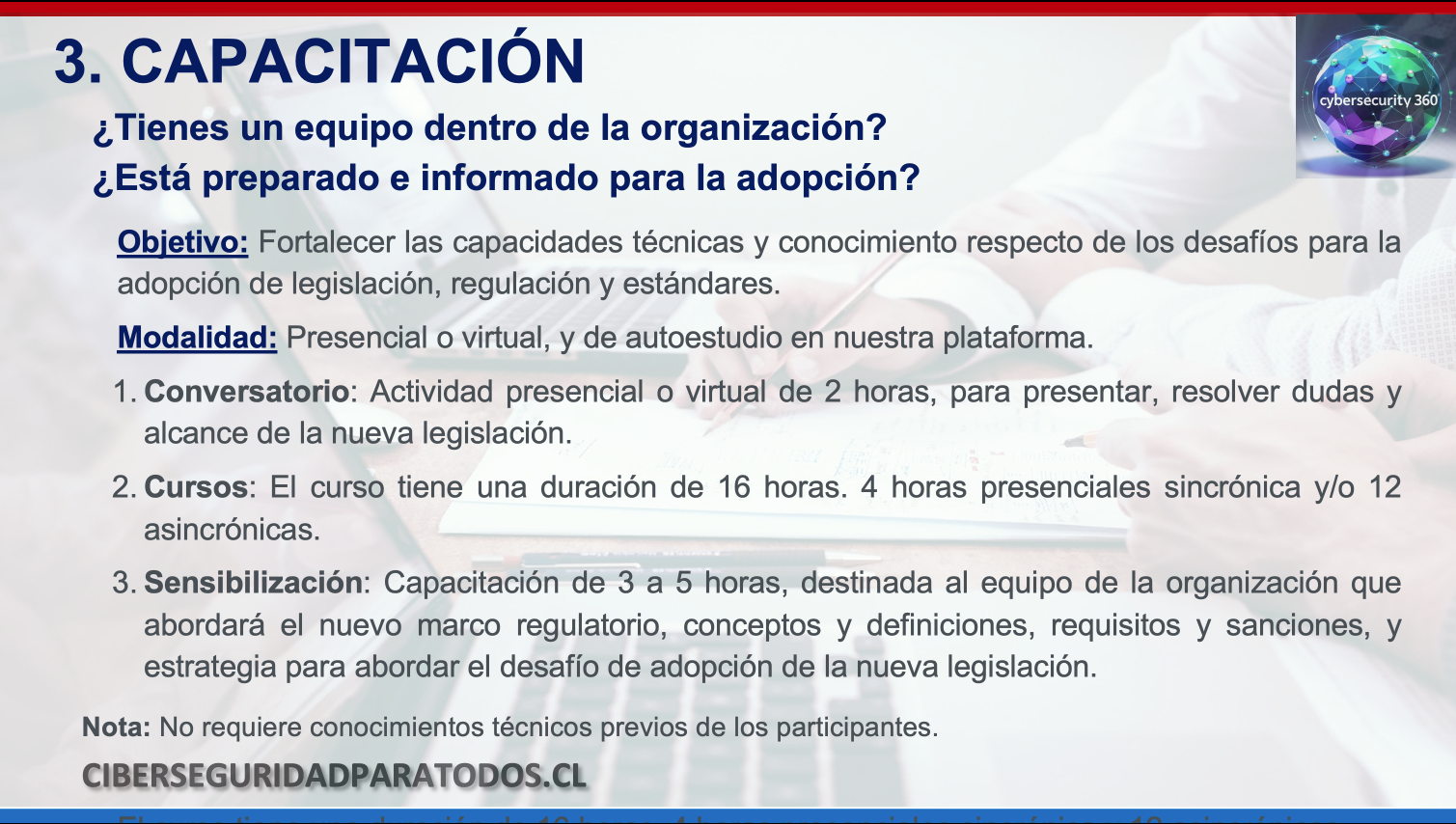 Preparar a su equipo para tener los conocimientos básicos de ciberseguridad, estándares, regulación y legislación.